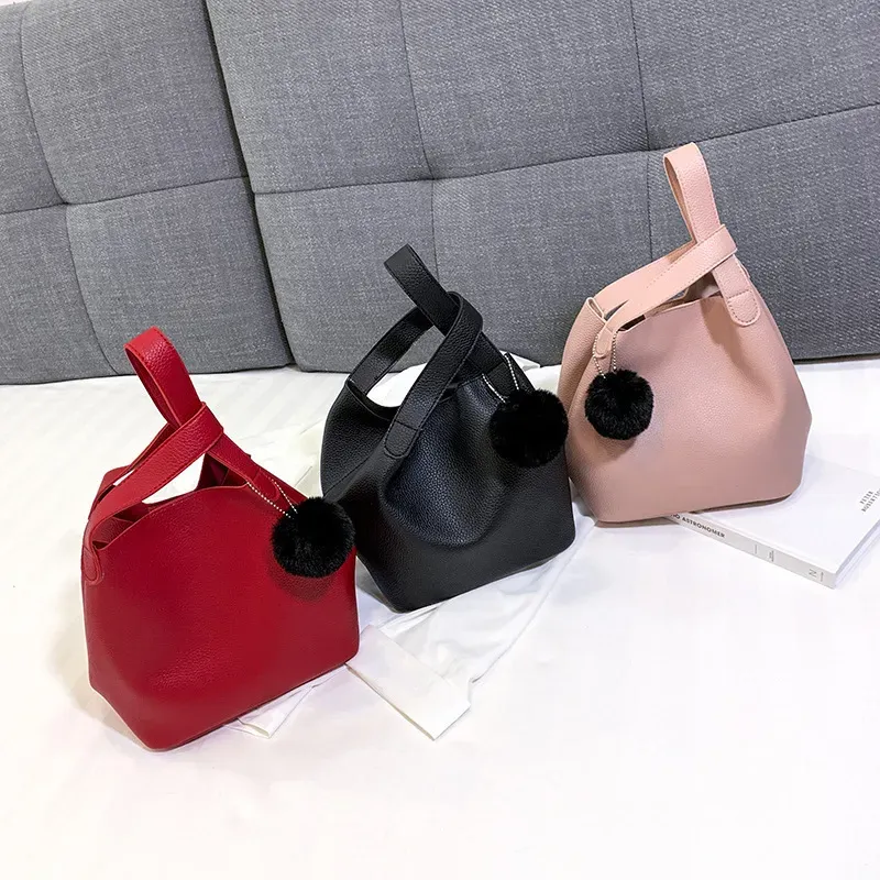 Women Vintage Pompon Design Solid Color Large Capacity Bucket Shoulder Handle Bag