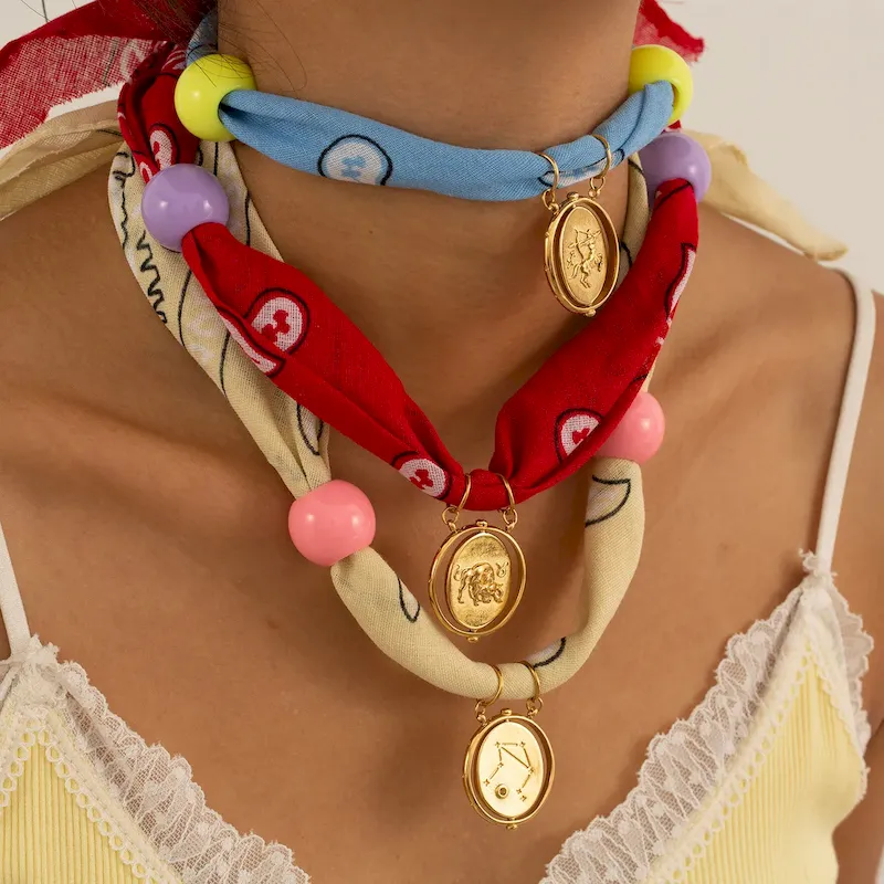 Wholesale Personalized Twelve Constellations Zodiac Satin Scarf Steel Pendant Necklace