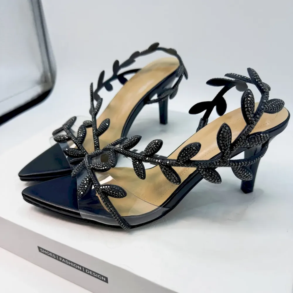 Women Fashion Sexy Rhinestone Leaves Pointed Toe Thin High Heels