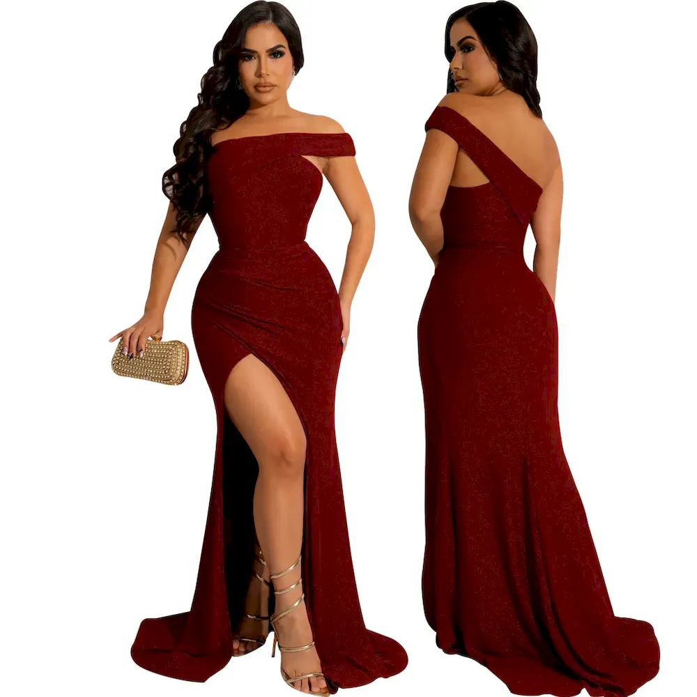Women Fashion Sexy Oblique Shoulder Split Tight Party Dress