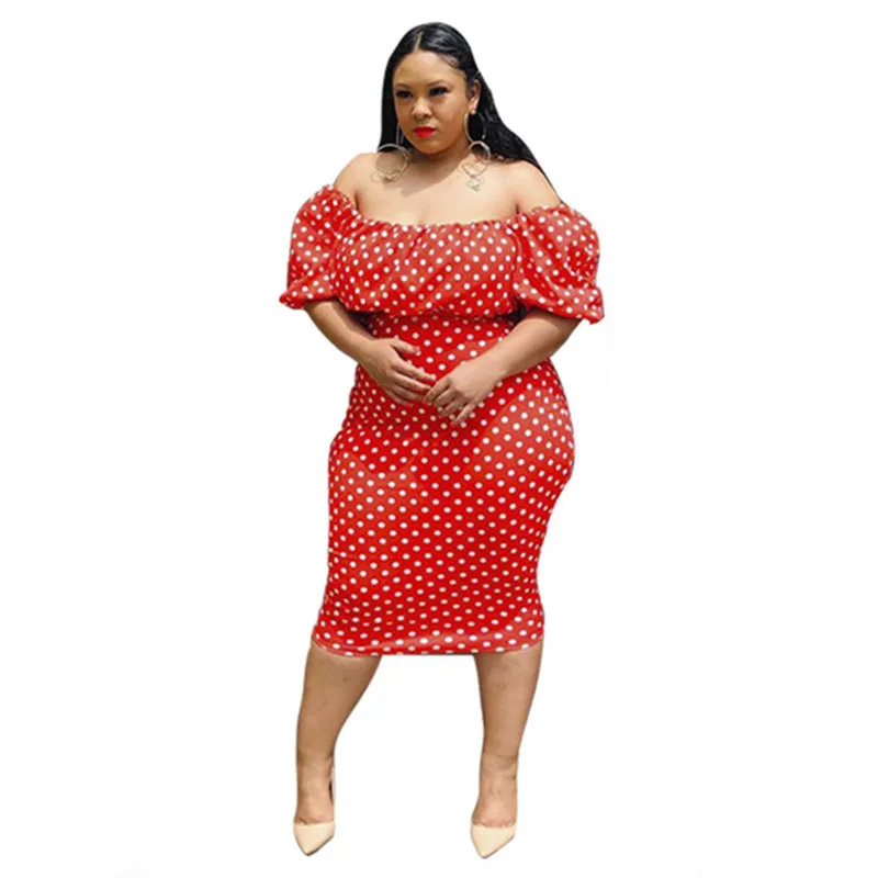 L-4XL Women Plus Size Off-the-Shoulder Lantern Sleeve Polka Dot Printed Bodycon Dress