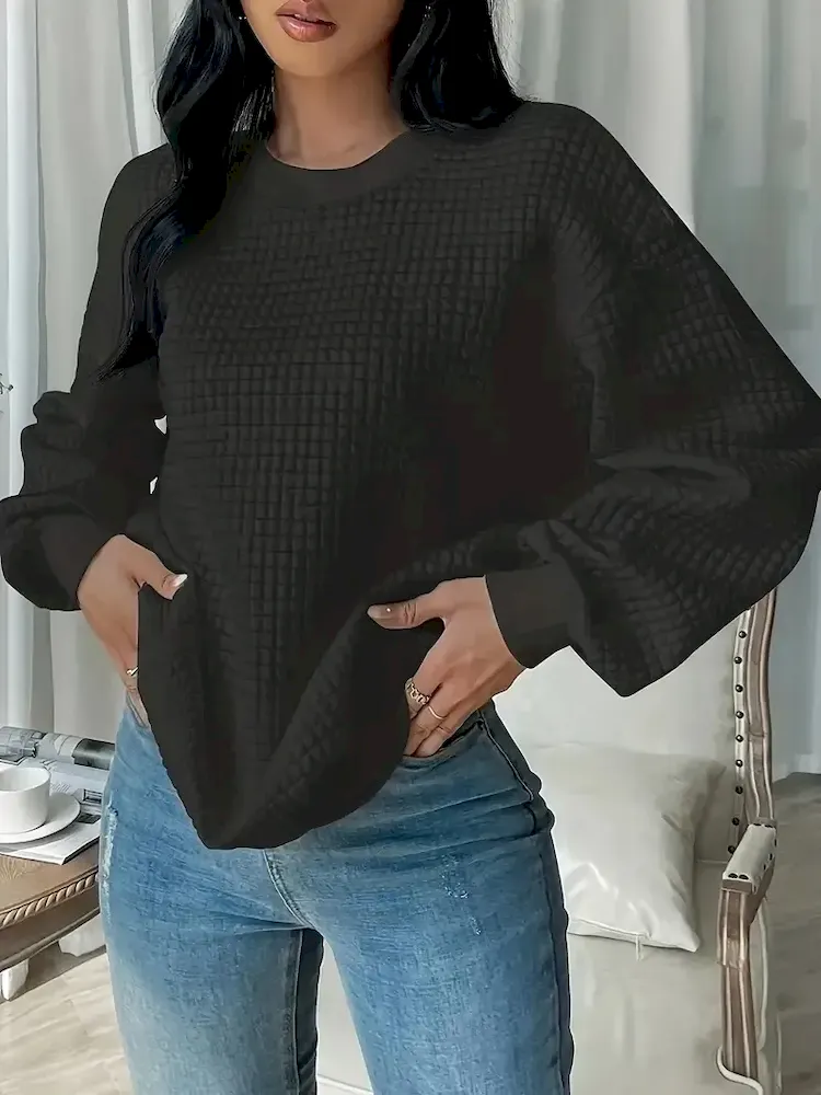 Women Fashion Casual Solid Color Plaid Crewneck Long Sleeve Sweatshirt