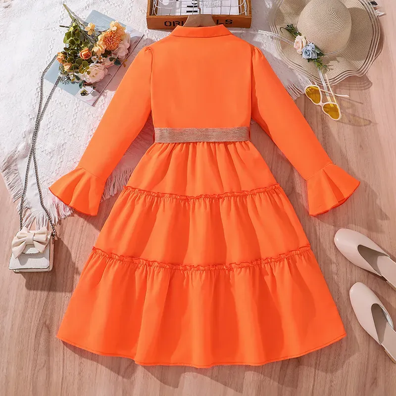 Wholesale Kids Girl’S Fashion Elegant Solid Color Lapel Long Sleeve Ruffled Dress